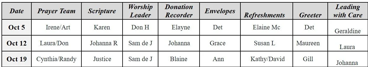 OCTOBER SCHEDULE OF VOLUNTEERS