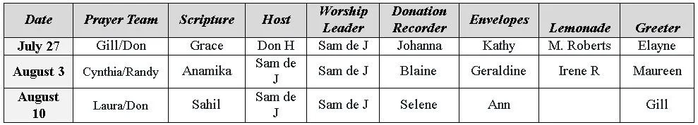 JULY/AUGUST SCHEDULE OF VOLUNTEERS