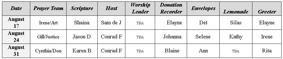 AUGUST SCHEDULE OF VOLUNTEERS