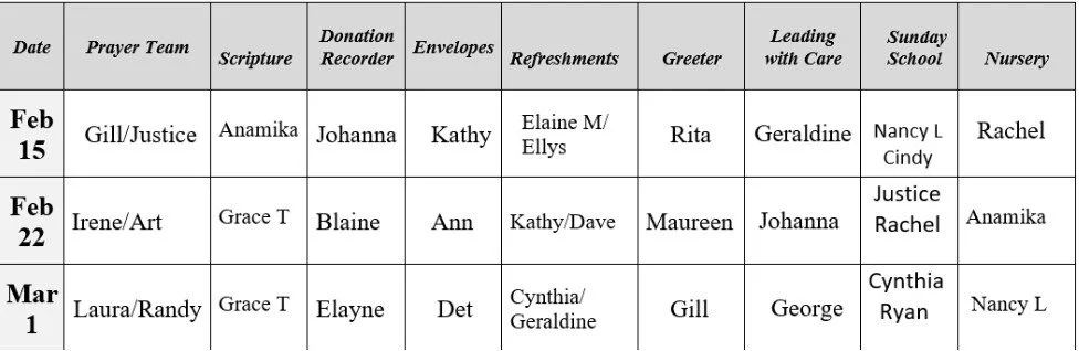 FEBRUARY SCHEDULE OF VOLUNTEERS