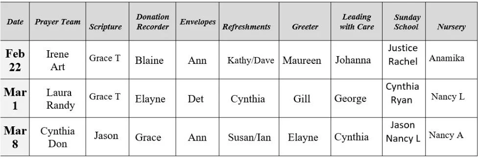 FEBRUARY SCHEDULE OF VOLUNTEERS Please let me know if there are any dates which I need to change or move for you 😊 If you would like to join the volunteer team even once every few months, let me know.