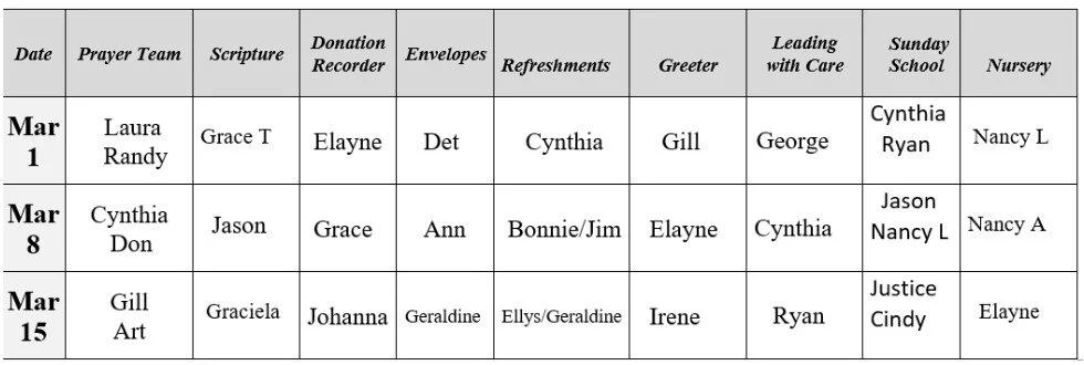 MARCH SCHEDULE OF VOLUNTEERS