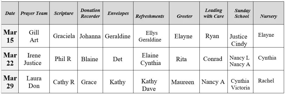 MARCH SCHEDULE OF VOLUNTEERS