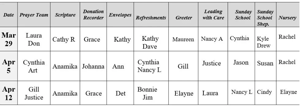 MARCH SCHEDULE OF VOLUNTEERS