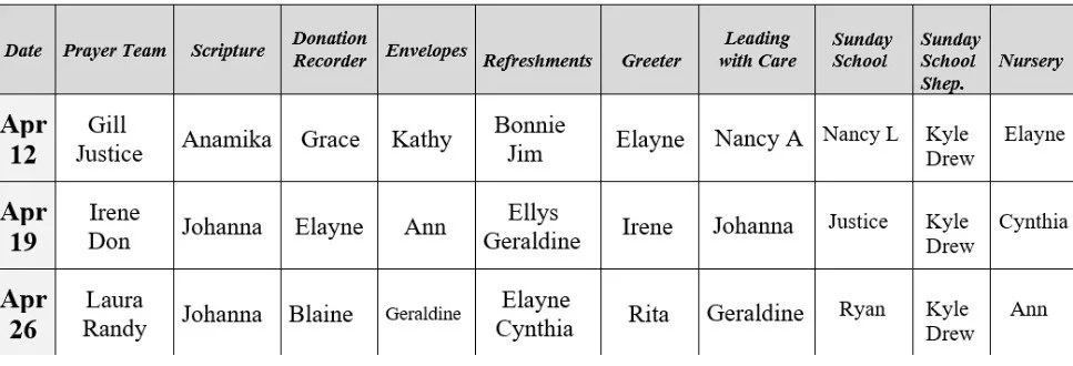 Below is the schedule for the Nursery, if there are any switches made please let the office know so they can update the schedule. The office number is 905-820-9860.