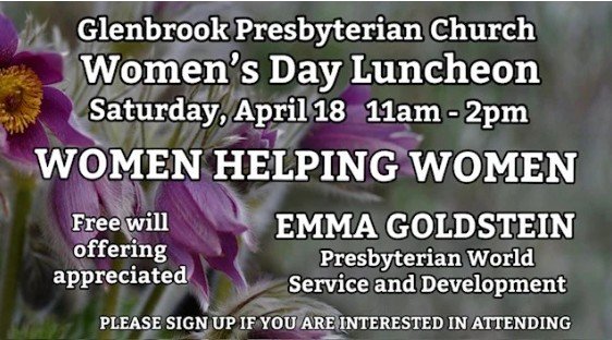 We will host a Women’s Luncheon on Saturday, April 18 from 11am-2pm for the women from Glenbrook and St. Thomas A Becket churches. This is the last week to sign up, Emma Goldstein from PWS&D will be speaking about the work they are doing to help women in their international ministries. Please sign up if you are interested in attending. A free will offering is appreciated on the day of the event.