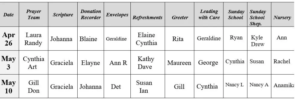 APRIL/MAY SCHEDULE OF VOLUNTEERS